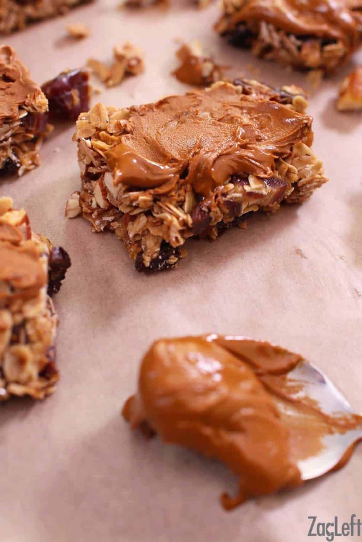 - Using a knife or the back of a spoon, spread the melted cinnamon chips over each granola square. Place the squares onto parchment until set.