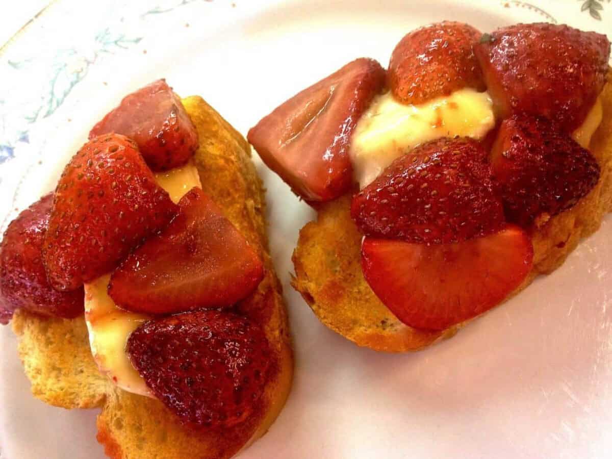 - Slice several slices of the french bread and toast both sides. Add a few slices of brie and top with the roasted strawberries.